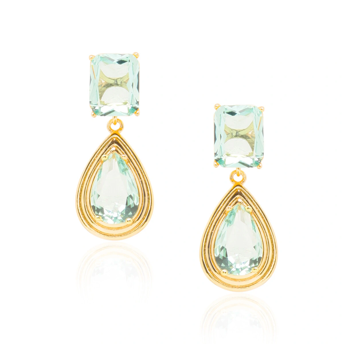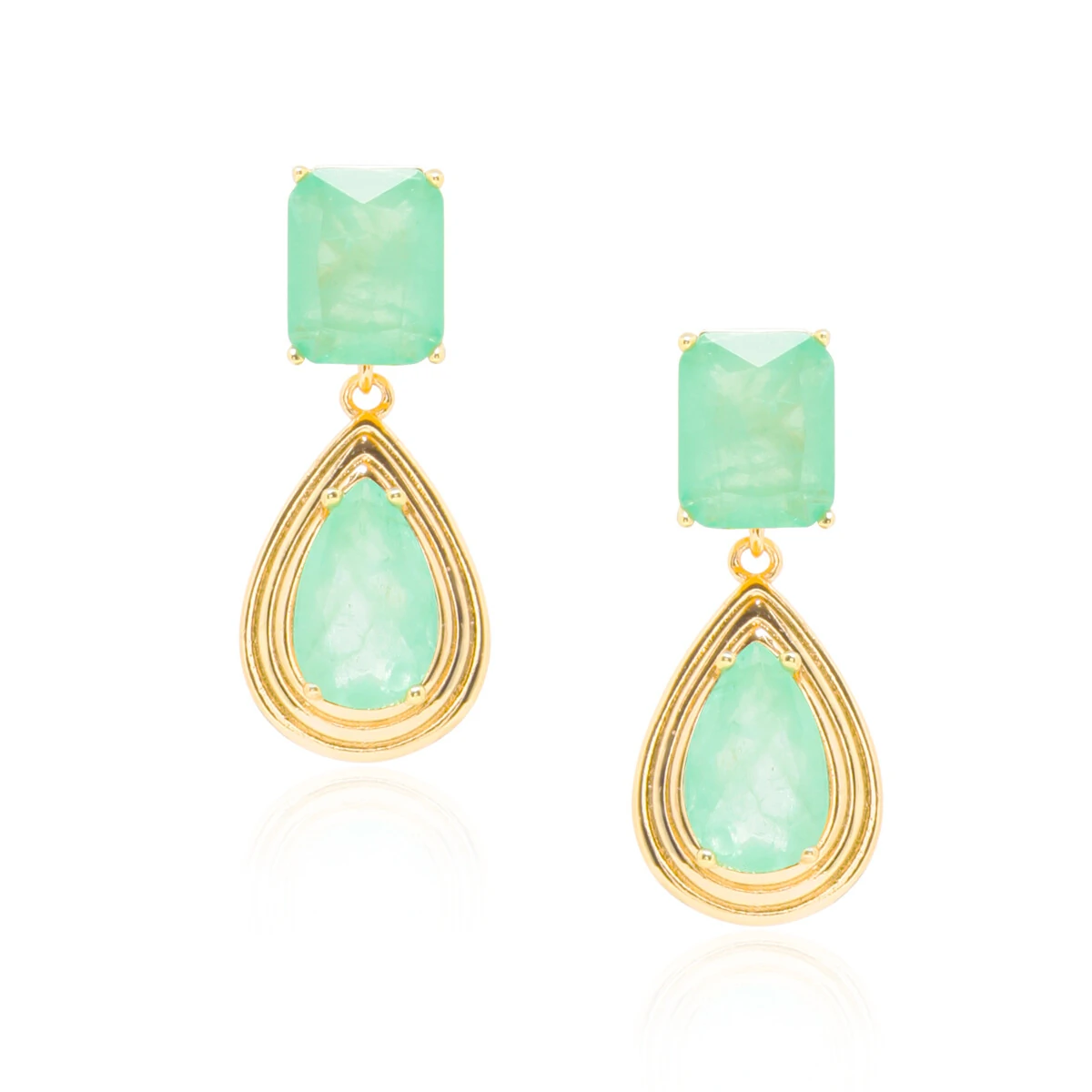 Brinco delicado com pedra retangular na base e pingente em formato de gota