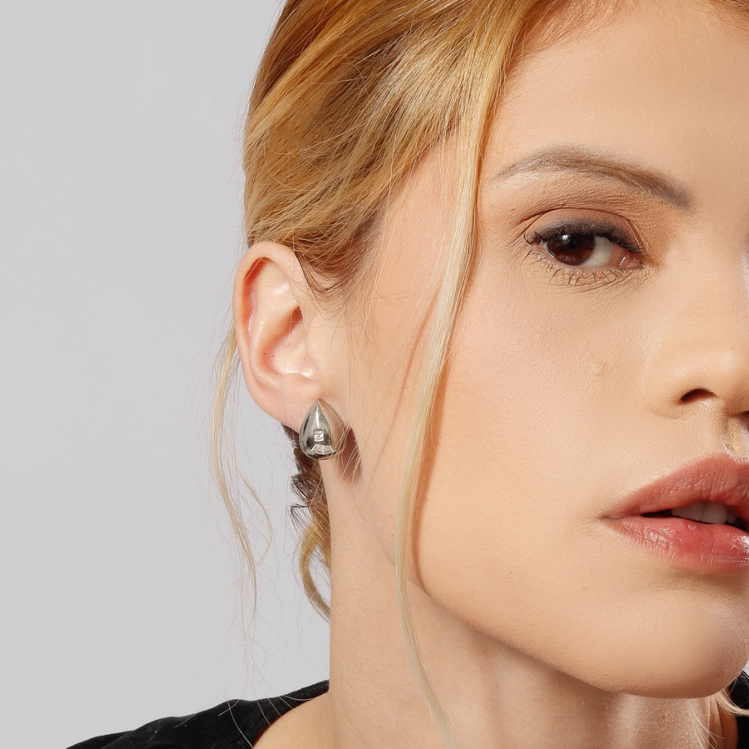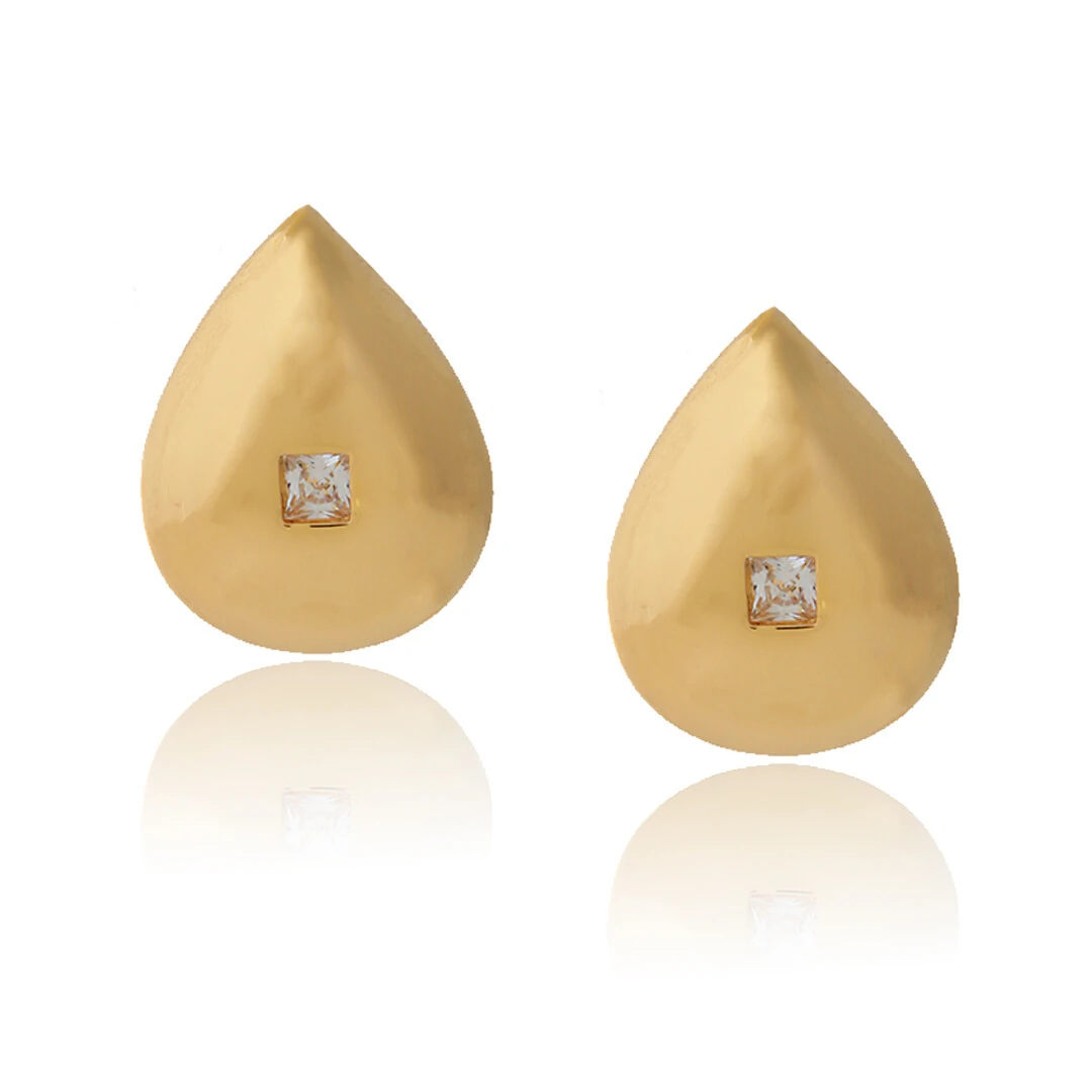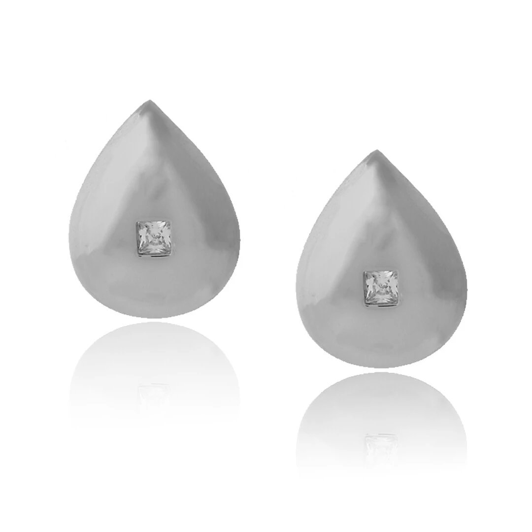 Brinco com superfície lisa em formato de gota com detalhe central em zircônia
